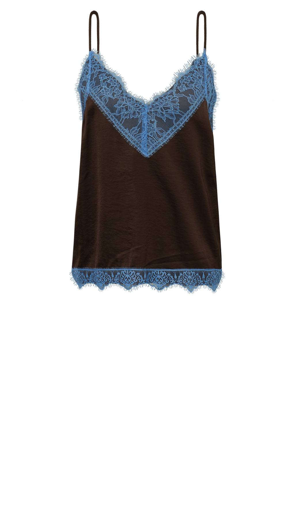 Lækker satin top med smuk blondekant og justérbare stropper, der understreger det feminine og elegante look. De høje slidser i siden giver et moderne og flatterende fald, mens den bløde, glatte kvalitet sikrer et eksklusivt udtryk.