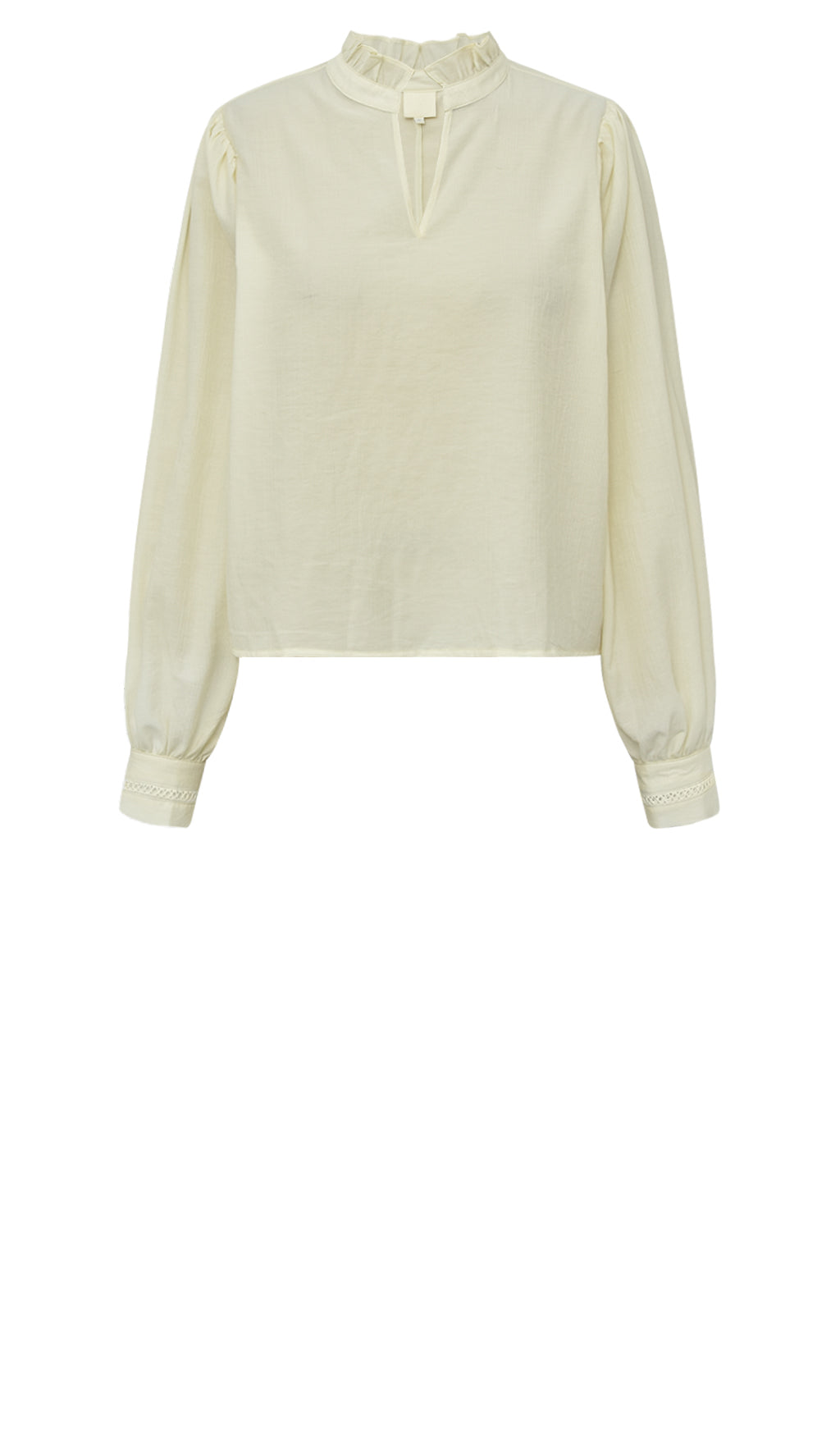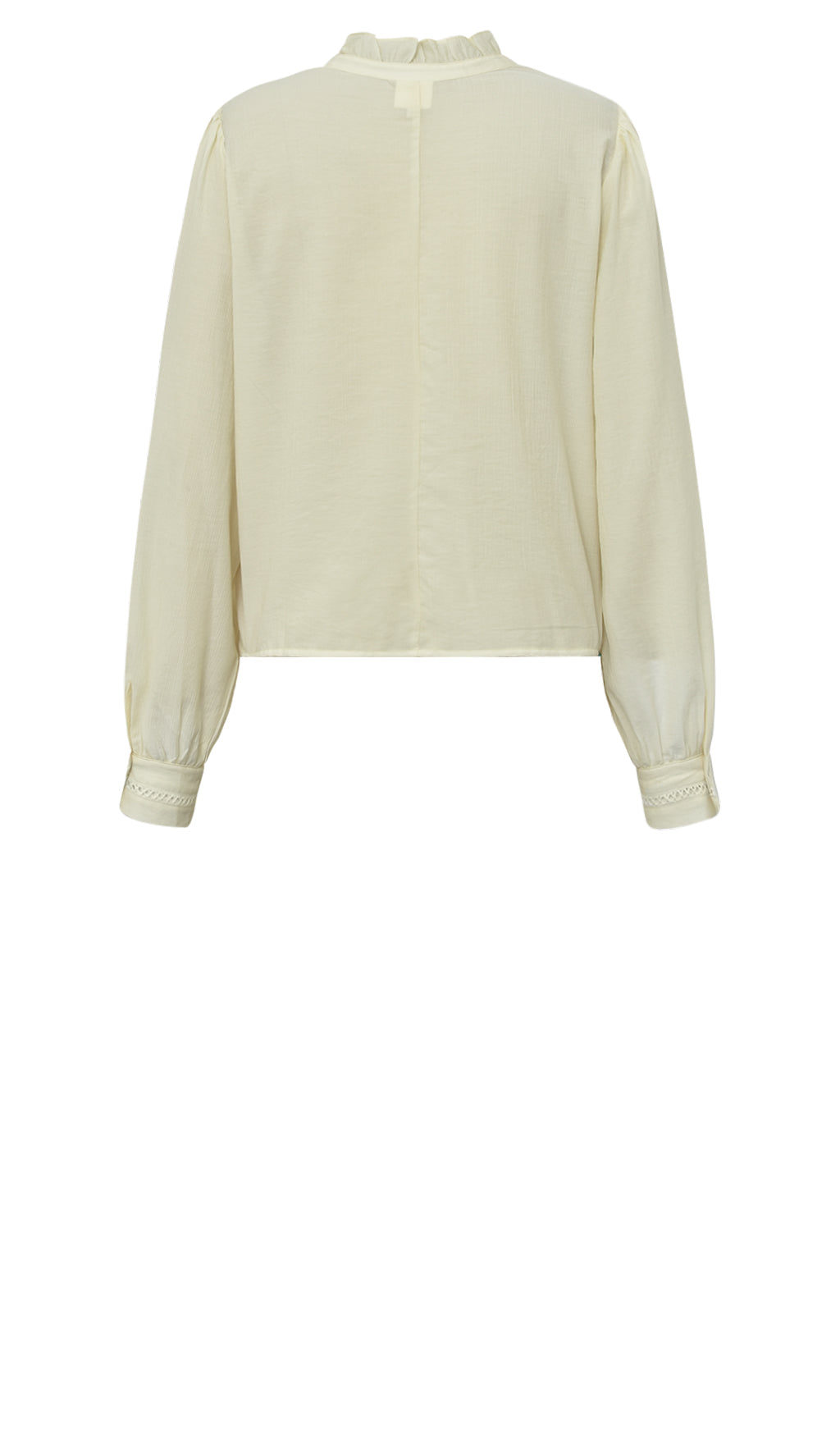 Enkel og elegant bluse med en fin lille flæse i kraven og smukke blondedetaljer ved manchetterne. Et feminint design, der kan bruges til både hverdag og festlige lejligheder.