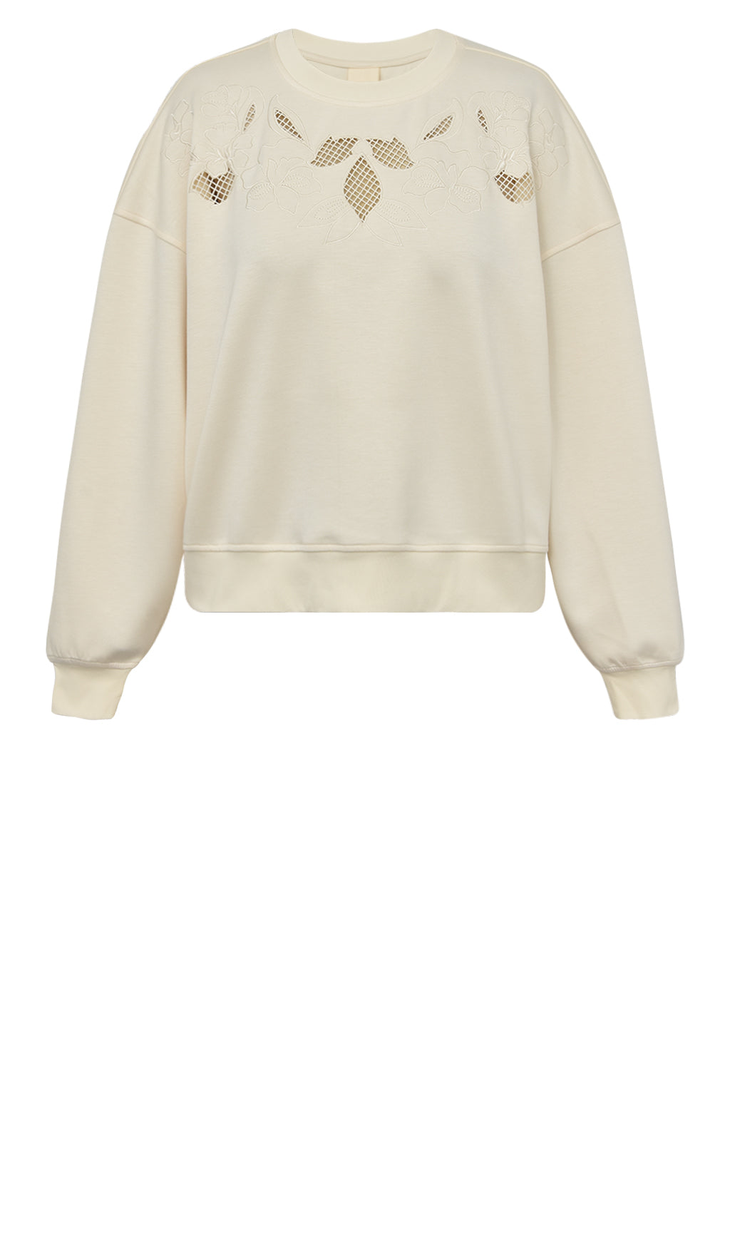 Flot sweatshirt med smukt broderi kombineret med mesh på fronten, der tilfører et ekstra feminint touch til den klassiske sweatstil. Komfort og elegance i én og samme style.