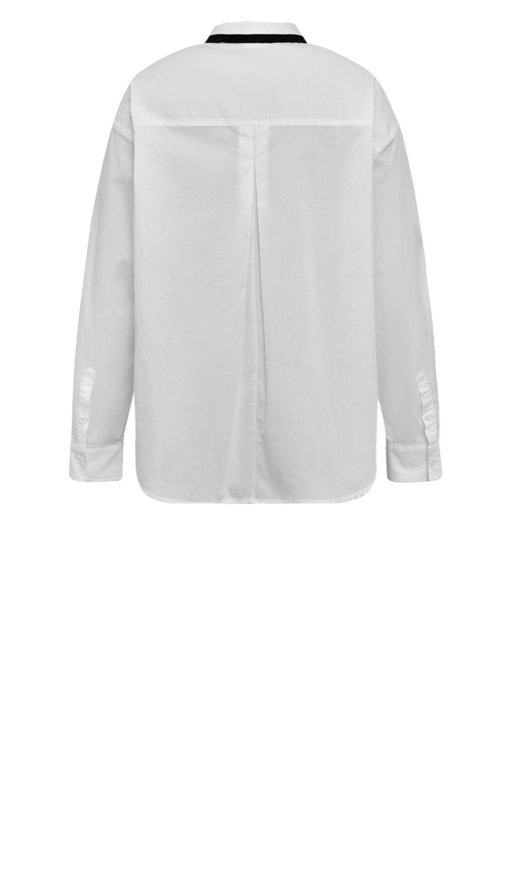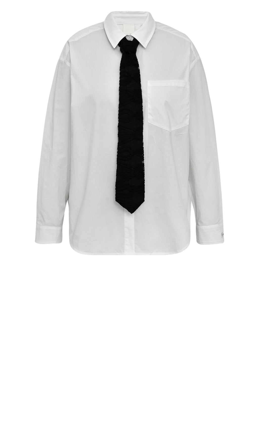 Hvid skjorte med sort blondeslips – et enkelt, klassisk og stilrent look med et feminint twist. Perfekt til både kontoret og særlige anledninger.