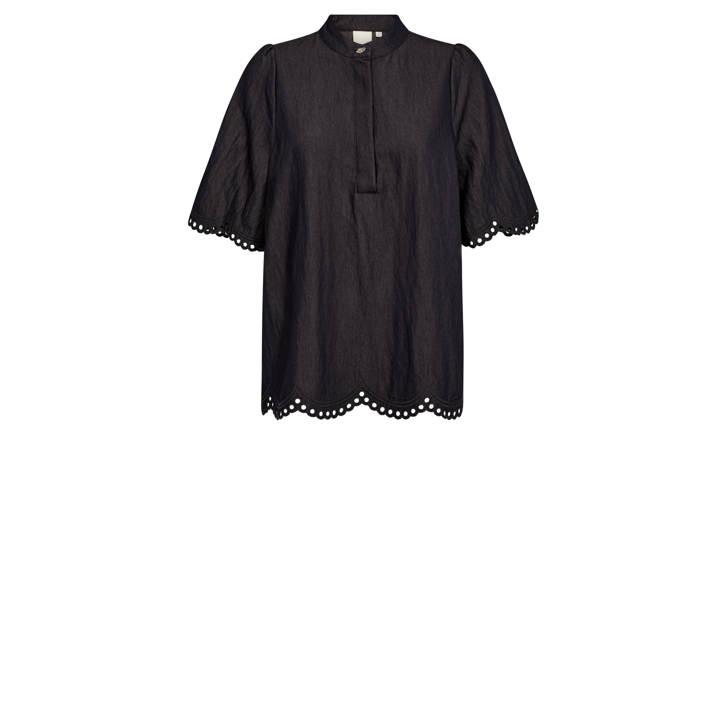 MikaGO Blouse er en elegant bluse med fine blondekanter ved både ærmer og bund, som tilfører et feminint og raffineret udtryk. Den enkle, fine krave afsluttes med en smuk sølvknap i organisk form, der giver et eksklusivt og stilfuldt finish. En tidløs bluse, der nemt kan styles til både hverdag og fest.