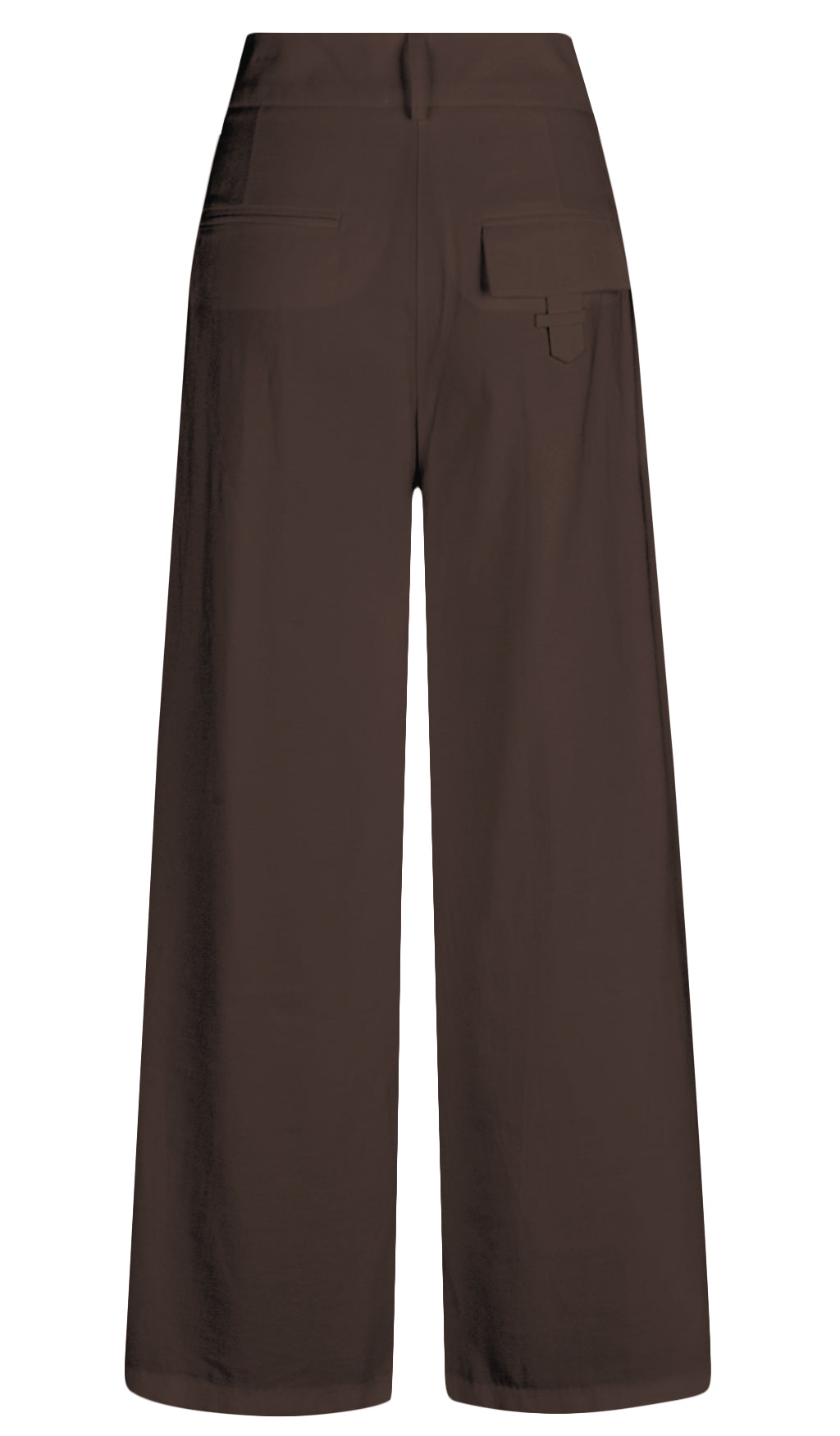 Buksen er med paspolerede side lommer for og paspolerede bag lommer bag, hook og bar lukning i talje og lynlås i gylp. Buksen har dybe stukne læg foran.