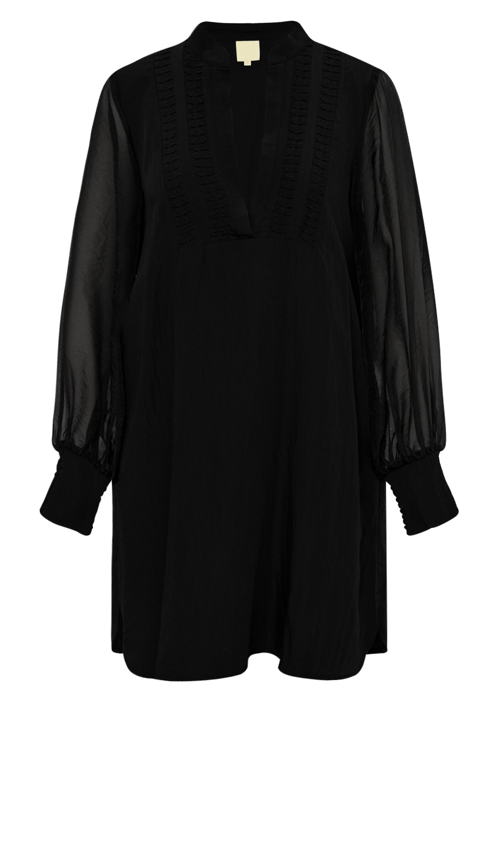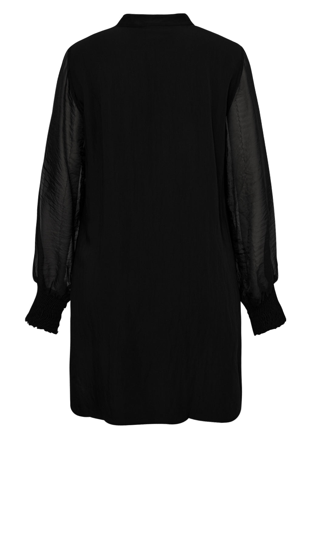 Smuk tunika-kjole i en lækker viskose/polyamid-blanding, der giver et let skinnende og eksklusivt udtryk. Flot dekorativ detalje på fronten og let transparente ærmer, som afsluttes med en fin elastisk smock for både komfort og stil.