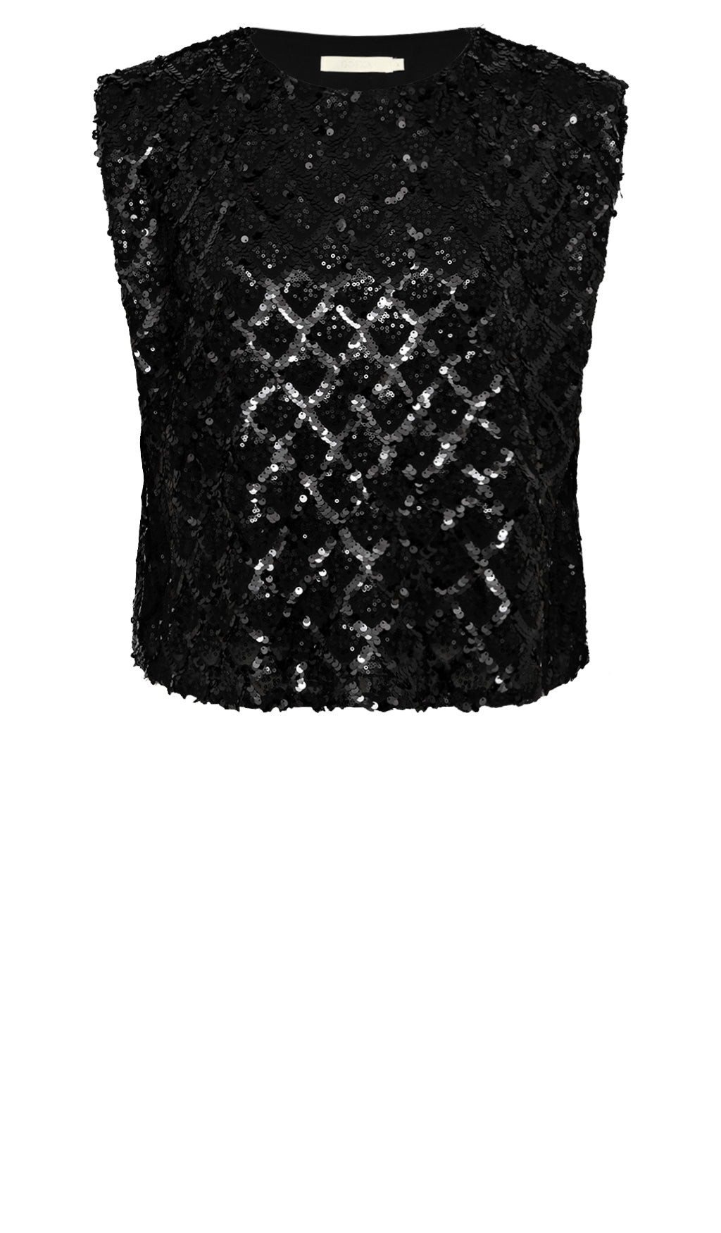 Skøn paillettop med et smukt mønster og fine skulderpuder, der giver et delikat og sofistikeret udtryk. Perfekt til at løfte ethvert outfit og tilføje et strejf af glamour til både hverdag og fest.